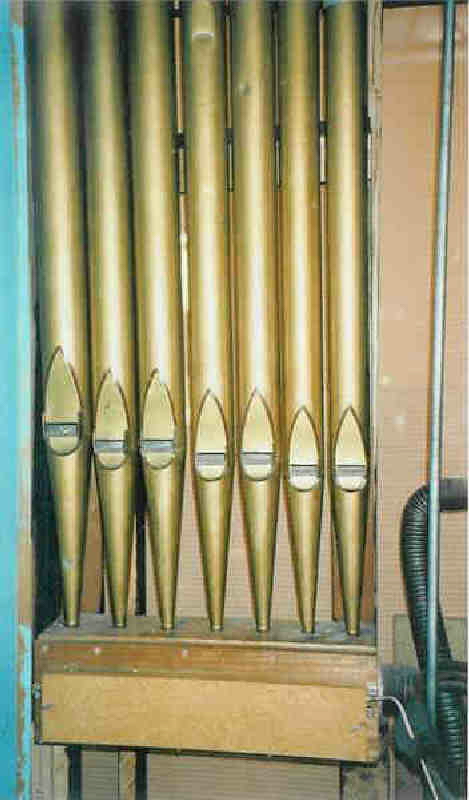 The extant Great 8' Open Diapason pipes are painted gold with brown