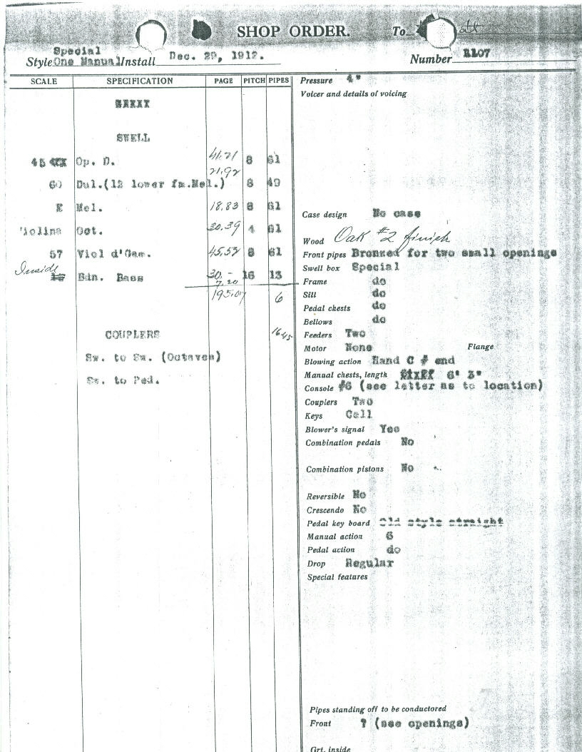 Swell8 Open Diapason 61 pipes8 Melodia 61 pipes8 Viol da Gamba 49 pipes8 Dulciana 61 pipes4 Octave 61 pipes16 Bourdon Bass 13 pipesSw to Sw 4Sw to Ped