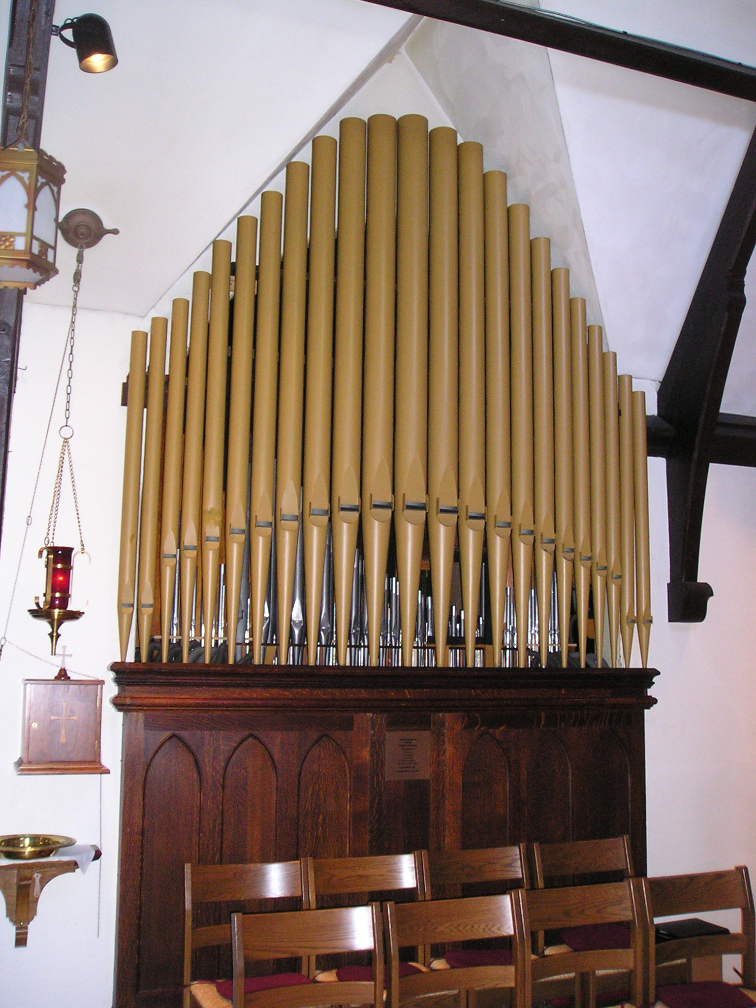 "The $40,000 that St. Andrew's raised in 2002 provided for a complete renovation of our Estey Organ. All of the original leather in the windchests and the reservoir (bellows) were replaced. It is quite amazing that the leather installed in 1916 survived as long as it did throughout the organ, especially given the fact that a nearby tannery fire in Ayer poured smoke into the church soon after Ray Douglas had finished his work. Of course, all parts were cleaned; worn parts were repaired or replaced. The most exciting part was that new pipework was installed to add brightness to the sound, an addition that both makes the organ more versatile and supports a wider range of singers. A 2' pincipal was added on the swell, a II rank mixture was added on the great, and the swell oboe was made playable independently on the pedal. All the pipes were re-voiced as necessary to provide a harmonious whole and they were regulated for proper volume control and balance in the sanctuary.