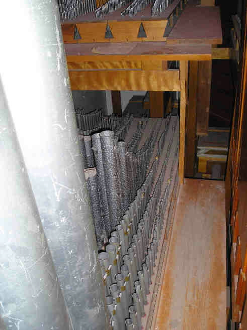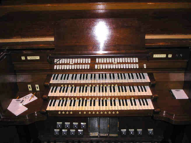 Swell (enclosed) 8 Geigen Diapason 8 Concert Flute 8 Viola da Gamba 8 Viola Celeste 4 Principal 4 Chimney Flute III Dolce Cornet 8 Trumpet 8 Oboe 4 Clarion Tremolo Pedal 16 Open Diapason 16 Rohrbourdon 16 Lieblichgedeckt 8 Principal 8 Flute 4 Super Octave 16 Posaune 8 Trumpet |
