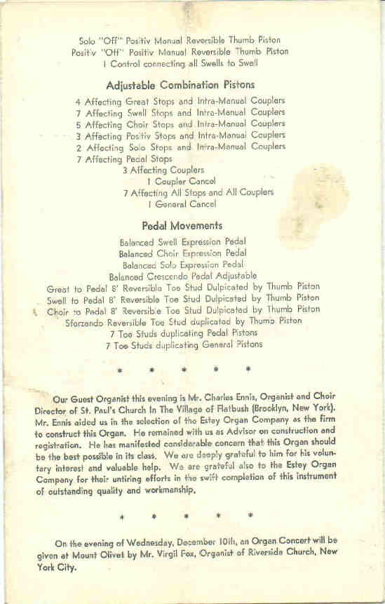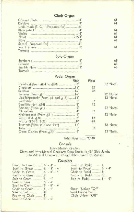 Choir 8 Concert Flote 8 Dulciana II Unda Maris (prep.) 4 Kleingedeckt 4 Violina 2 2/3 Nasat 2 Flote III Scharf (prep.) 8 Vox Humana Tremolo Positiv (prepared for) 8 Rohrflote 4 Nachthorn 2 Principal 1 1/3 Quinte III-IV Cymbal 8 Krummhorn Tremolo Pedal 32 Resultant 16 Diapason 16 Subbass 16 Pommer 16 Lieblich Gedeckt 8 Octavbass 8 Pommer 4 Choralbass 4 Kliengedeckt 2 Octav IV Mixture 16 Trumpet 8 Tuba 4 Oboe Clarion |